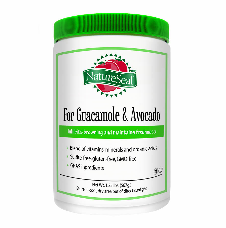 NatureSeal® for Guacamole and Avocado is an FDA-approved vitamin, mineral and organic acid blend that protects guacamole and cut avocado from oxidation. NatureSeal eliminates browning of guacamole for up to 5 days after opening, when refrigerated and extends the shelf life fresh-cut sliced avocado for up to 10 hours refrigerated. Protects and maintains the natural texture and color, without altering the flavor.